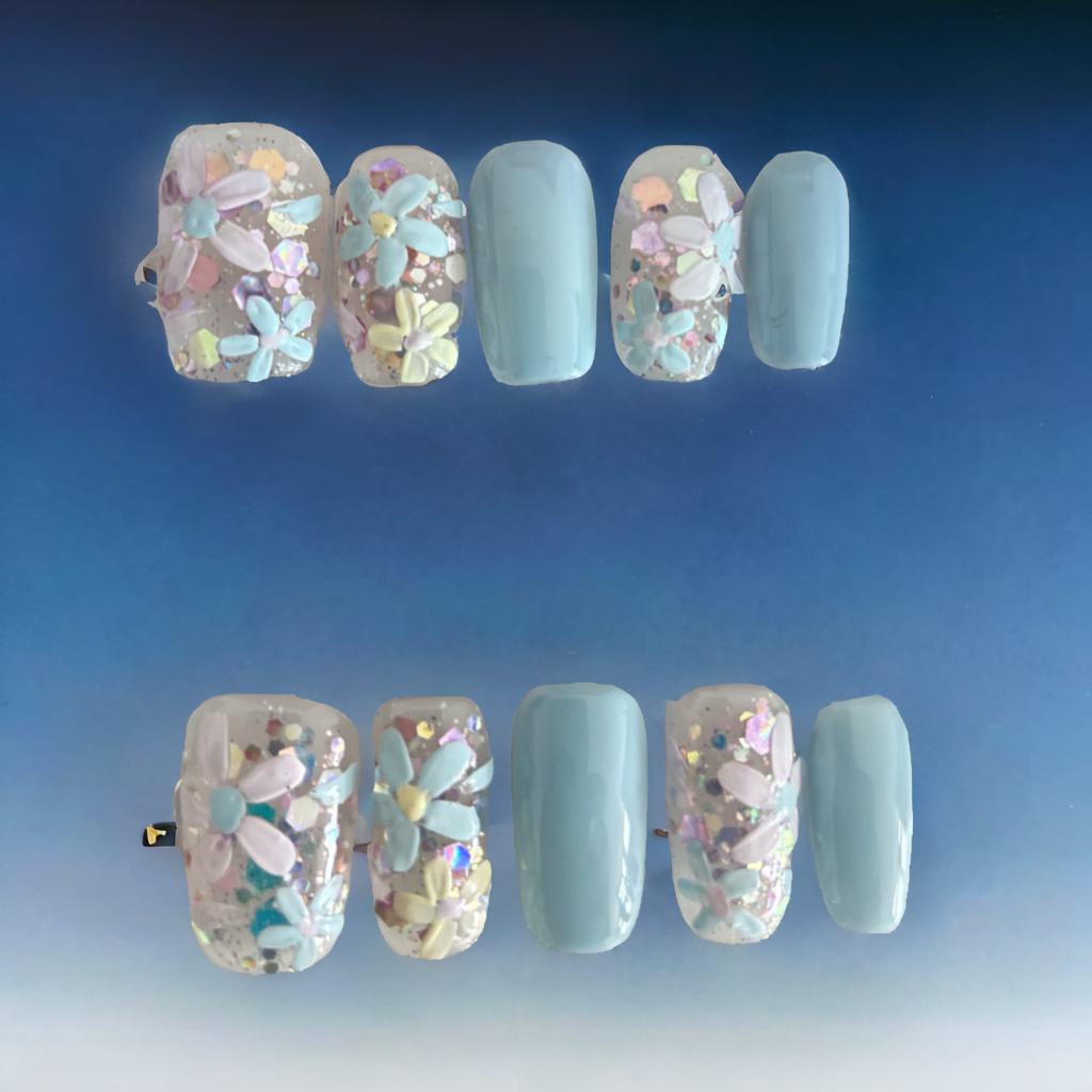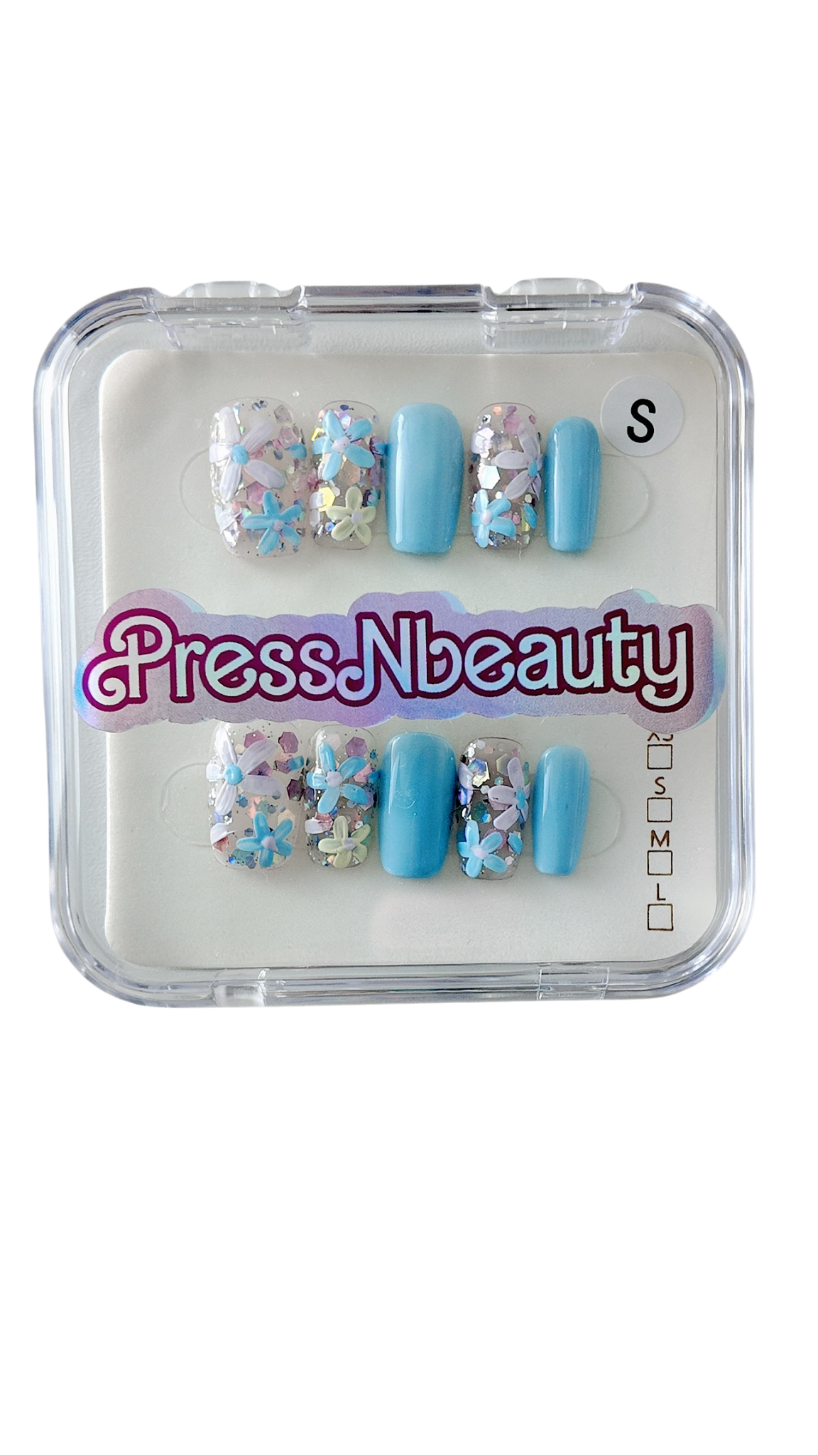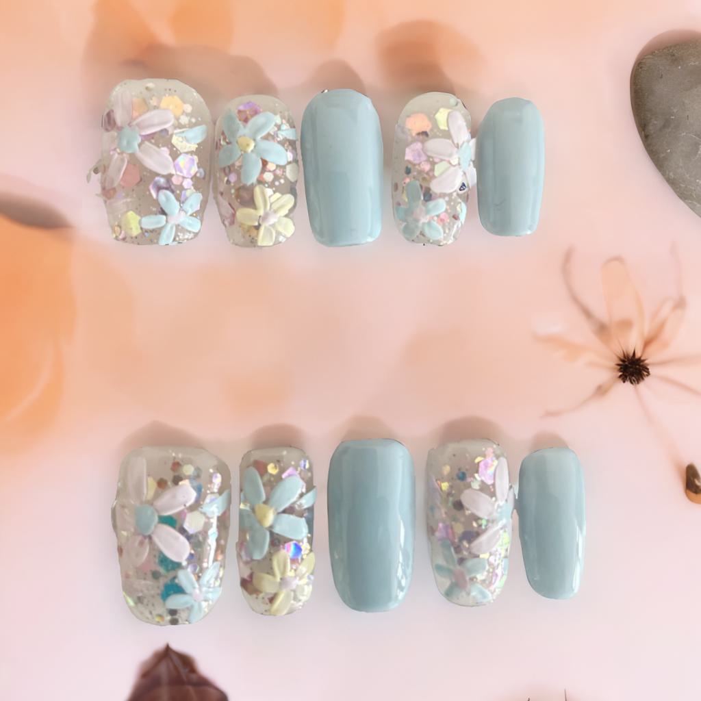 Capture the freshness of a clear morning sky with Blue Horizon from PressNBeauty — a dreamy mix of solid sky-blue nails and transparent glitter-tipped designs. Delicate floral accents bloom across the transparent nails, adding a soft romantic charm to the set. The perfect balance of color, sparkle, and elegance for any occasion.