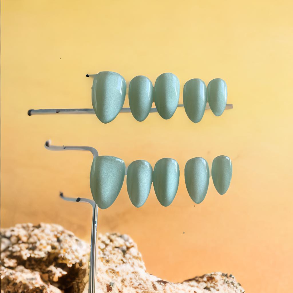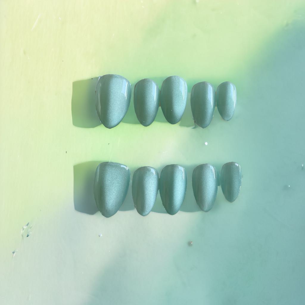 Bring a touch of magic to your fingertips with Celestial Ice, a set of light blue cat-eye press-on nails that shimmer like a frozen sky. With their glossy finish and shifting cat-eye glow, these nails capture the elegance of icy brilliance—fresh, chic, and enchanting.