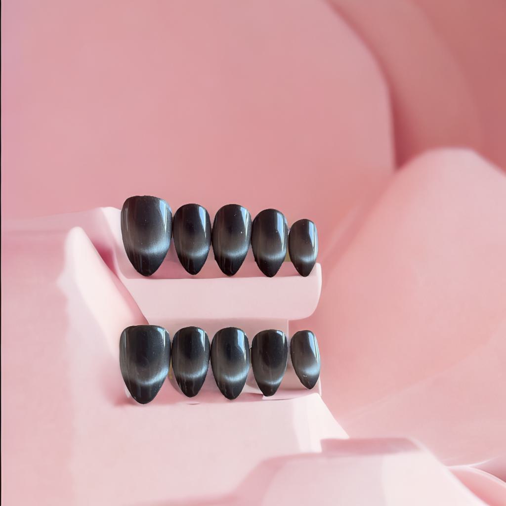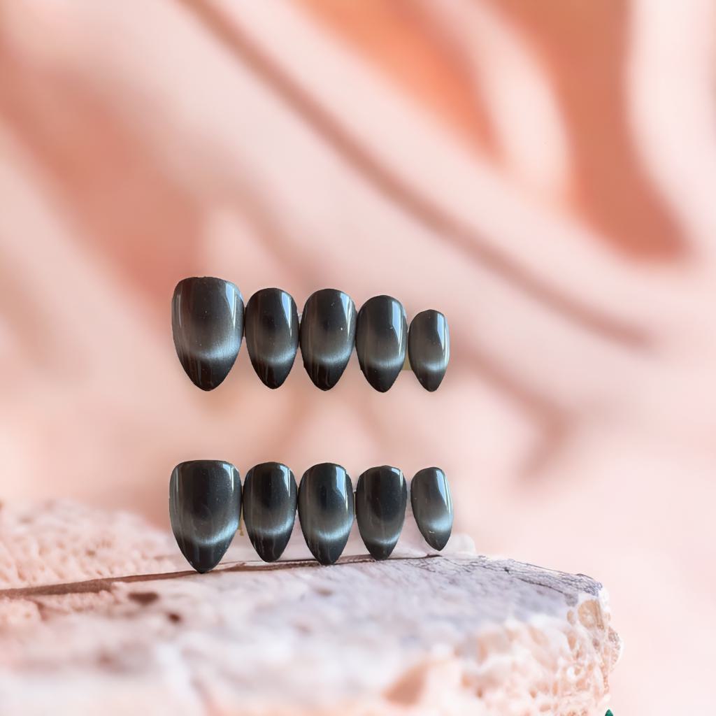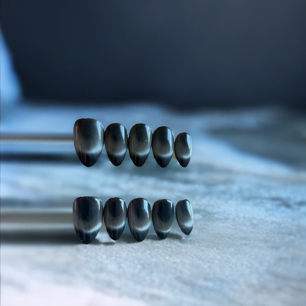 Black & Grey Glossy Cat-Eye Effect ā A dramatic, color-shifting look that evokes mystery and elegance.