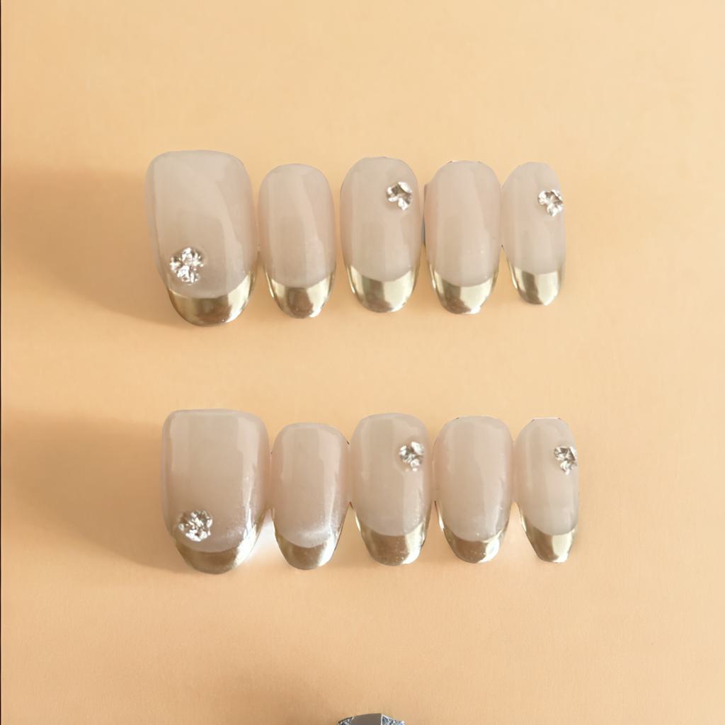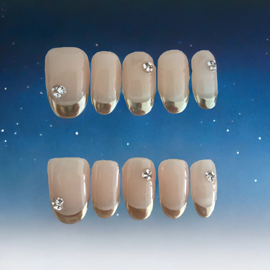 Redefine timeless elegance with Golden Halo from PressNBeauty — a modern twist on the classic French manicure. Featuring a nude base and lustrous golden French tips with a subtle cat-eye shimmer, this set radiates sophistication from every angle. Each nail is accented with delicate diamond-like stones, adding just the right touch of glamour for any occasion.