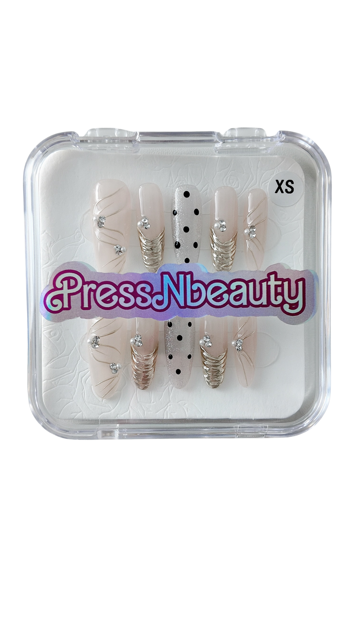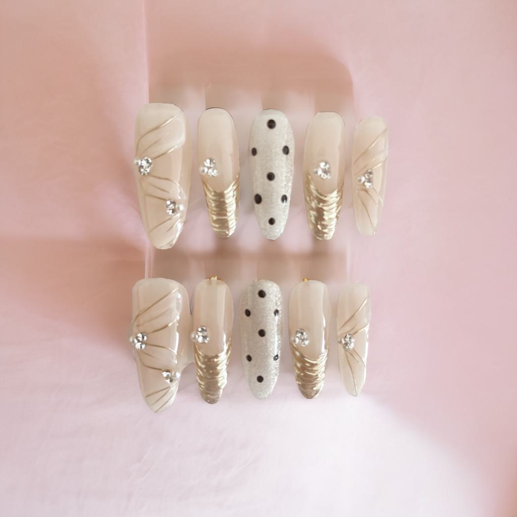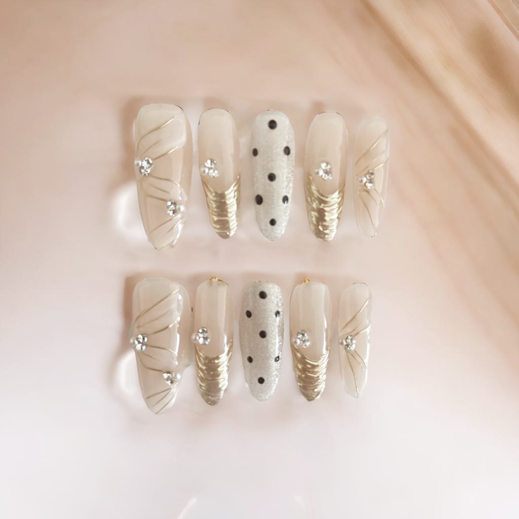 Indulge in luxury with Golden Veil from PressNBeauty — a sophisticated nude-toned press-on nail set featuring a stunning mix of designs. Some nails shimmer in pure silver, others are adorned with delicate golden thread-like accents, while a select few showcase dainty black dots for a chic contrast. Diamond-like crystals and tiny pearls add a touch of opulence, making every hand movement sparkle.