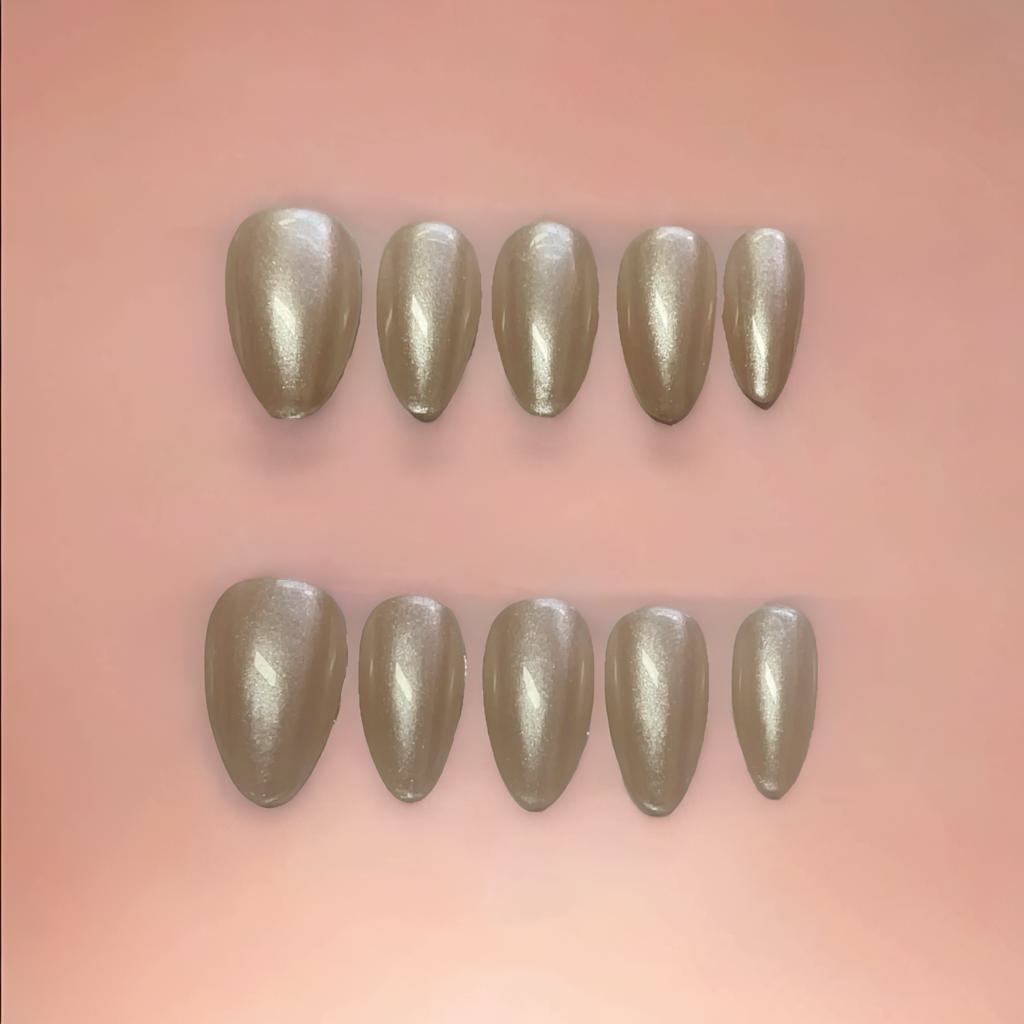 Handmade press-on nails with a smooth, donut-glazed chrome finish